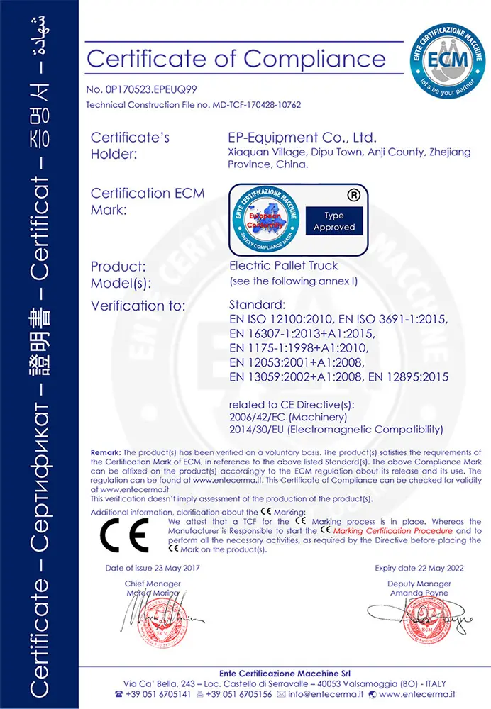 Сертификат EP-Equipment качество вилочных погрузчиков